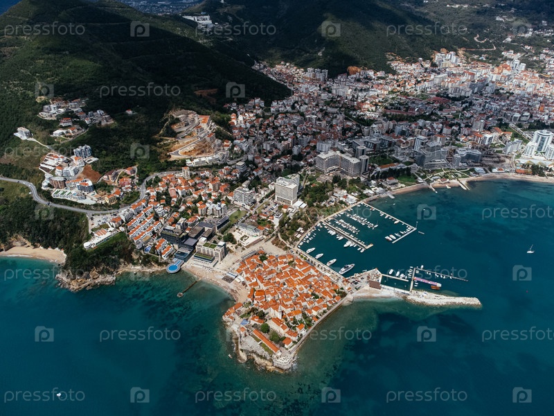 Вид с воздуха на Старый город Будва на Адриатическом побережье, Черногория, с яхтой и крышами из красной черепицы. g