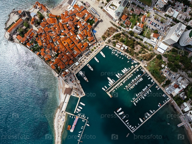 Вид с воздуха на Старый город Будва на Адриатическом побережье, Черногория, с яхтой и крышами из красной черепицы. g