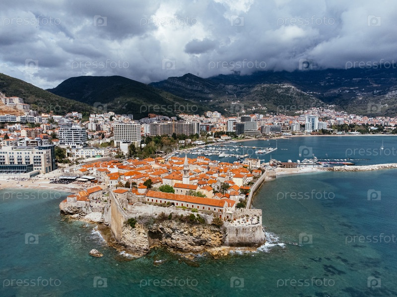 Вид с воздуха на Старый город Будва на Адриатическом побережье, Черногория, с яхтой и крышами из красной черепицы. g