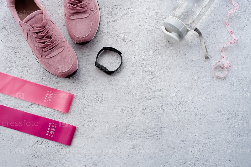 Здоровый образ жизни и фитнес в спорте, утреннее бегство. кроссовки, фитнесоустойчивые эластичные ленты, смарт-трекер для фитнеса, беспроводные наушники и бутылка с водой на сером фоне. вид сверху и плоский слой