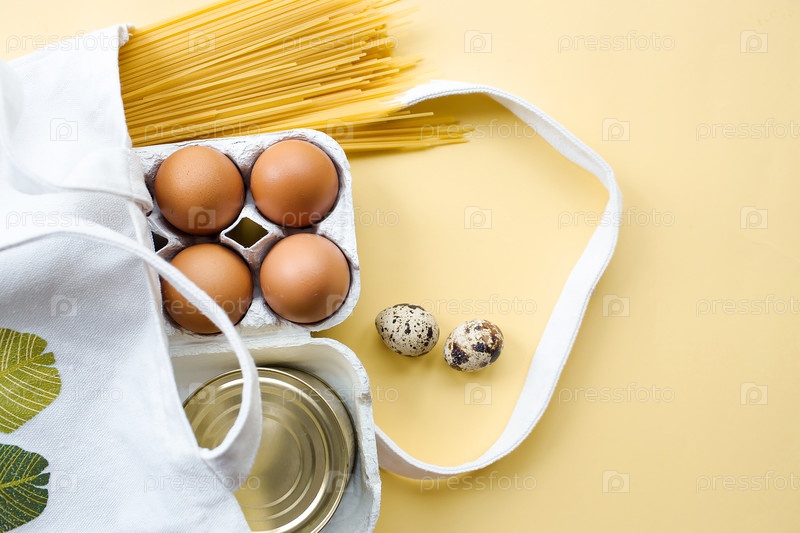 Кризис продовольственных поставок запасы пищи для карантинного периода изоляции на желтом фоне
