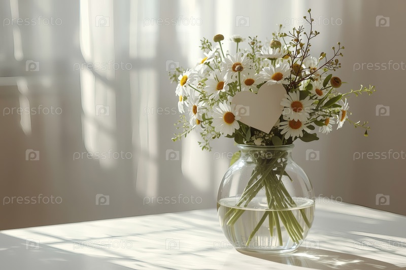 Концепция Дня семьи, любви и верности в России.Красивый, легкий и воздушный букет маргариток в стеклянной вазе на светлом фоне