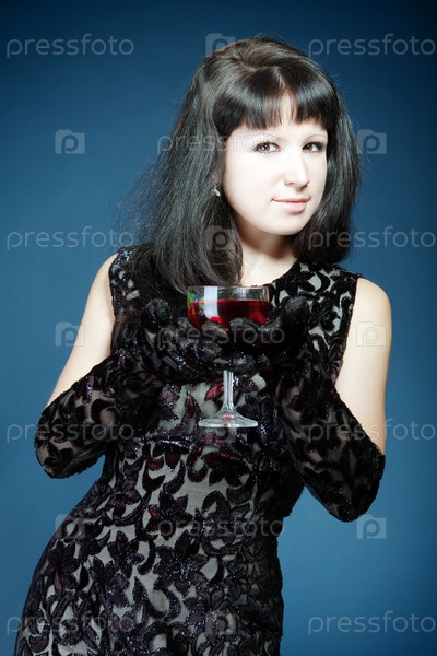 Женщина с бокалом вина на синем фоне