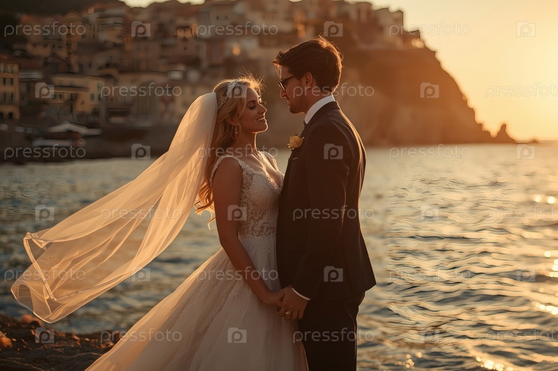 Свадебная пара обнимается у моря при закате солнца счастливые молодожены улыбаются невеста и жених создают семью