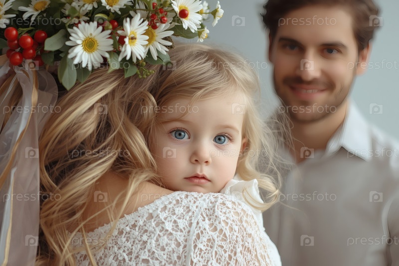 Концепция Дня семьи, любви и верности в России.Маленькая девочка с венком ромашек на руках у матери