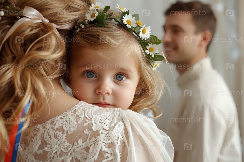 Концепция Дня семьи, любви и верности в России.Маленькая девочка с венком ромашек на руках у матери