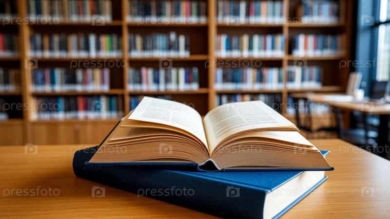 Раскрытая книга лежит на стопке старых книг на столе в библиотеке