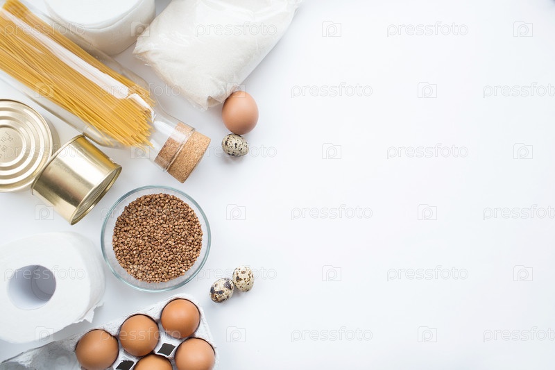 Продовольственные поставки кризисные запасы продовольствия на период карантинной изоляции Скан-продукты, макароны, яйца, гречка, туалетная бумага на белом фоне.Копирование пространства для текста