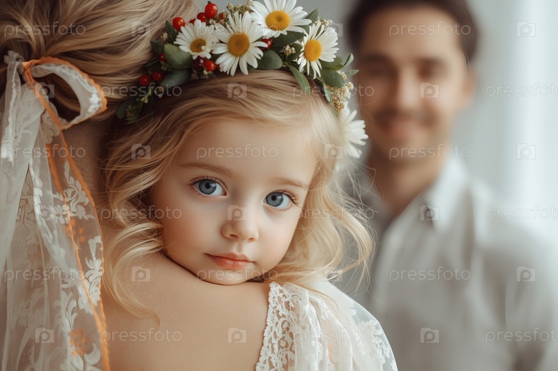 Концепция Дня семьи, любви и верности в России.Маленькая девочка с венком ромашек на руках у матери