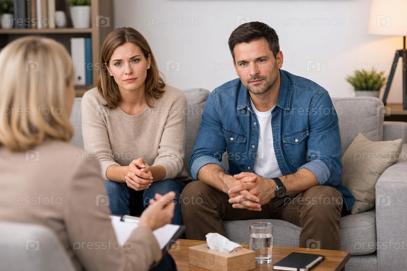 Супружеская пара на приеме у психолога в уютном кабинете: совместная консультация и терапевтическая беседа на диване
