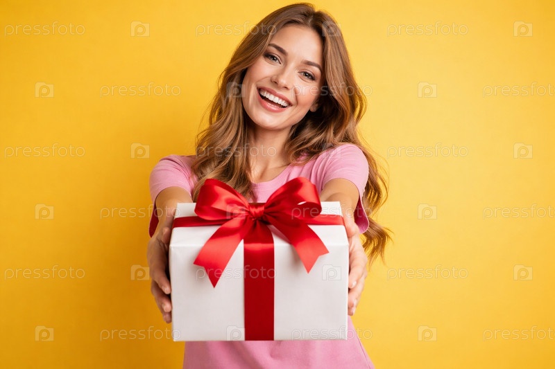 Молодая женщина в розовой футболке протягивает белую подарочную коробку с крупным красным бантом на ярком желтом фоне
