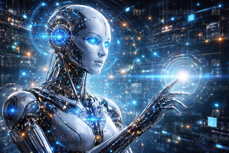 Футуристический гуманоидный андроид с металлическим корпусом и голубой подсветкой взаимодействует с голографическим интерфейсом в окружении цифровых частиц и сети данных
