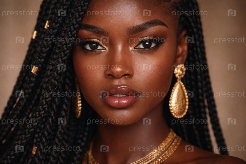 Портрет женщины с длинными плетеными косами и золотыми аксессуарами — крупный план шеи, многорядного золотого ожерелья и массивной серьги на теплом студийном фоне
