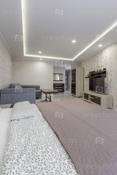 Просторная гостиная в современной квартире-студии с серым диваном, кофейным столом и телевизором. Яркий интерьер с цветочными обоями, ламинированными половками и декоративным потолком из поддонов со светодиодным освещением. Минималистский городской дизайн