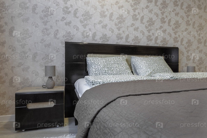 Близкий снимок современного интерьера спальни с темной деревянной кроватью со стилизованными подушками и соответствующим ночным столом с серой лампой. Стильный фон со светлыми цветочными обоями и мягким освещением окружающей среды. Элегантный дизайн город