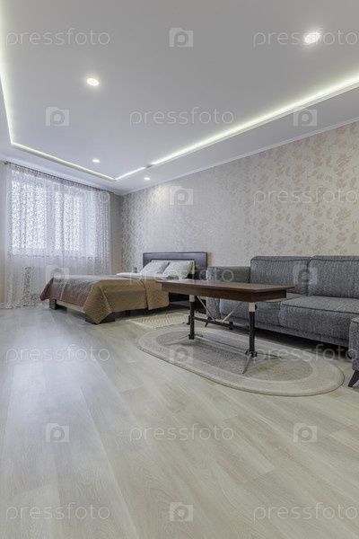 Просторный интерьер современной студийной квартиры с серым диваном, кофейным столом и большой кроватью на заднем плане. Яркая комната с декоративными цветочными обоями, ламинированными половками и многоуровневым потолком из поддонов со встроенным светодио