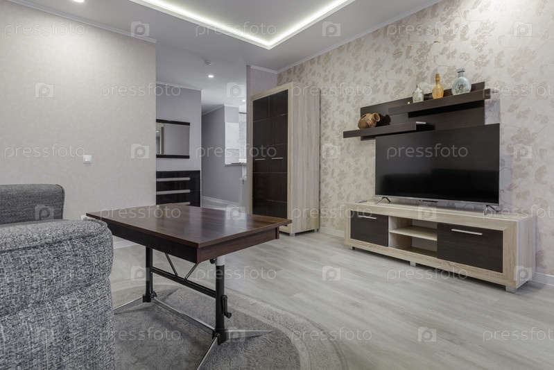 Интерьер современной студийной квартиры с темным деревянным кофейным столом, серым диваном и большим плоским экрановым телевизором на минималистическом стенде. Яркая комната с декоративными цветочными обоями, ламинированными половками и мягким углубленным