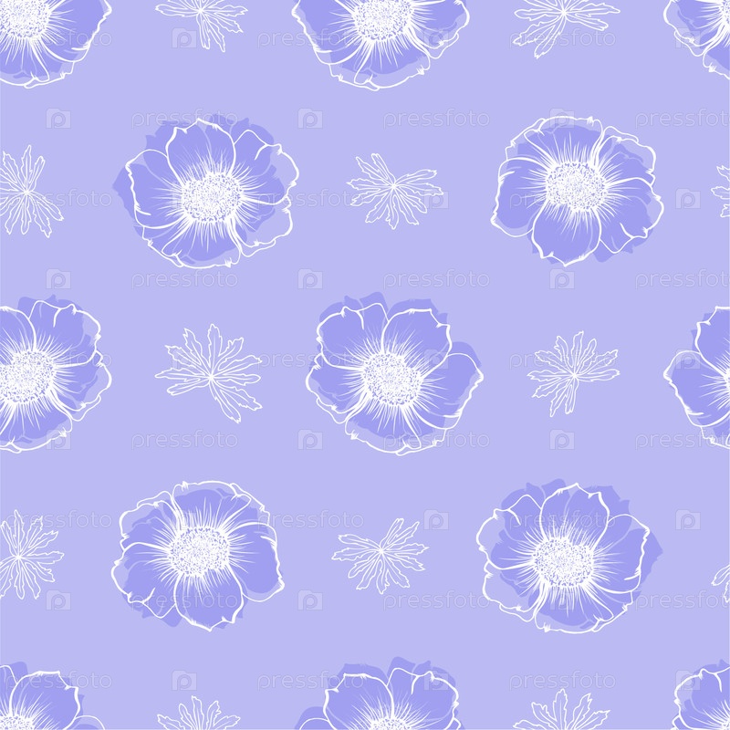 Бесшовный рисунок с ручной черточкой и силуэтом анемоновых цветов и листьев