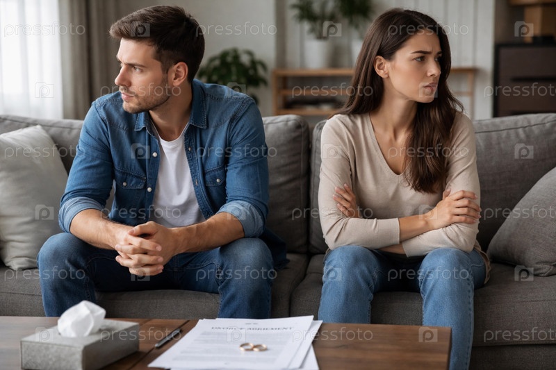 Пара в конфликте на диване: напряженная сцена с документами о разводе и обручальными кольцами на кофейном столике