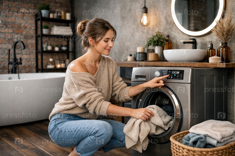 Женщина загружает полотенца в фронтальную стиральную машину и выбирает программу стирки в уютной ванной комнате в стиле лофт с деревянной столешницей и декором