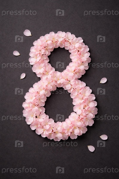Цифра 8, составленная из нежно-розовых цветочных лепестков на темном фоне — плоская композиция для поздравлений к 8 Марта, весеннего декора и романтических открыток