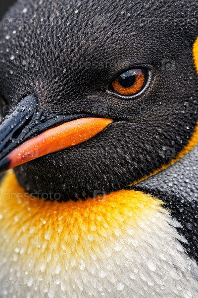 Крупный план королевского пингвина: детальный портрет с каплями воды на перьях, ярким оранжево‑желтым клювом и выразительным глазом
