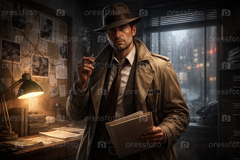 Частный детектив в плаще и федоре в своем кабинете ночью: нуарная сцена расследования с папками, доской улик и сигаретой на фоне дождливого городского окна