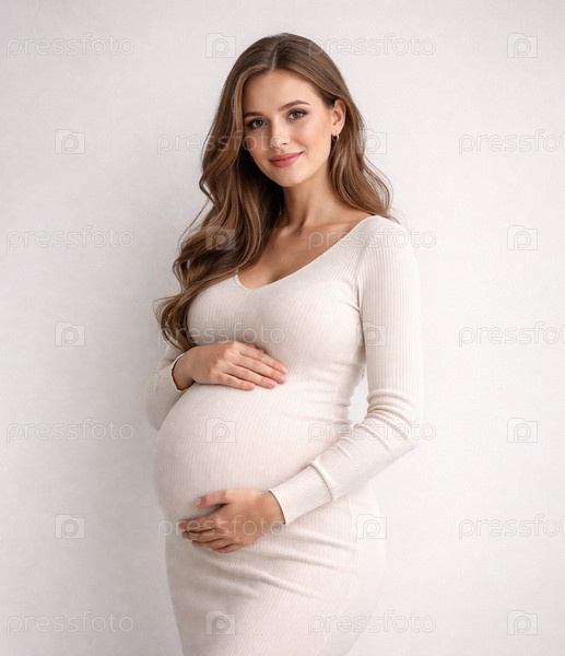 Беременная женщина в облегающем белом платье стоит в студии, держит руки на животе — трогательный портрет будущей мамы в третьем триместре