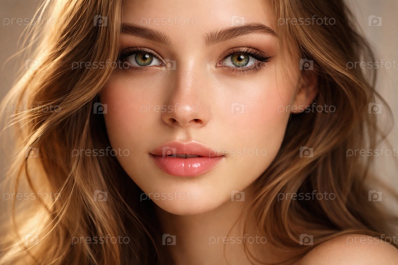 Студийный портрет женщины с длинными волнистыми светло-русыми волосами, мягкое золотистое освещение, акцент на текстуре волос и плечевом силуэте