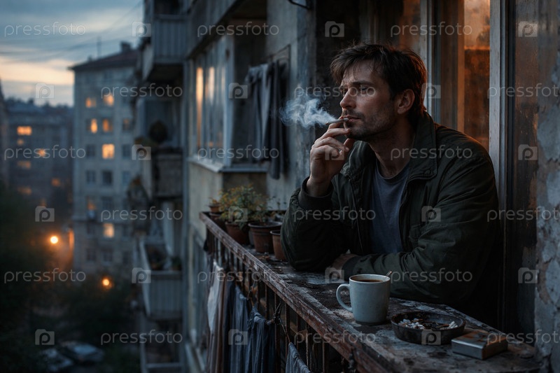 Задумчивый мужчина на городском балконе вечером: чашка кофе, сигарета и клубы дыма на фоне старых многоэтажек в сумерках