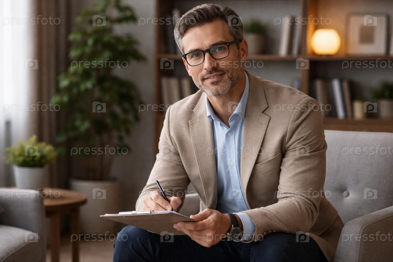 Мужчина‑консультант в бежевом пиджаке делает записи в блокноте во время консультации в уютном кабинете с книжной полкой, растениями и мягкой подсветкой — деловой портрет специалиста в рабочей обстановке