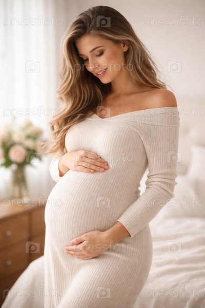 Женщина в облегающем светлом трикотажном платье, нежно поддерживающая живот, в уютной спальне с пастельным букетом на заднем плане, мягкое естественное освещение, интерьерная съемка