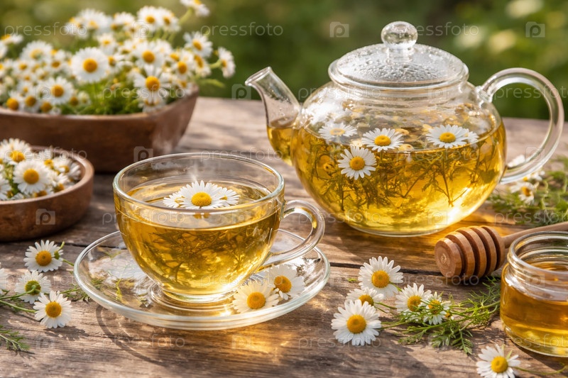 Ромашковый чай в прозрачном стеклянном чайнике и чашке на деревянном столе с медом и свежими цветами ромашки — уютный летний натюрморт для релаксации и здорового образа жизни