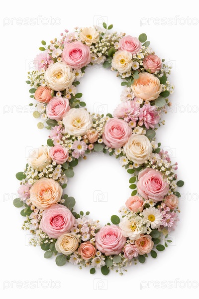 Цифра 8, составленная из пастельных роз, ранункулюсов, ромашек и эвкалипта на белом фоне — изящный весенний венок для открыток, поздравлений и оформления праздника 8 марта