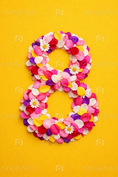 Цифра «8», выложенная из розовых, фиолетовых, белых и желтых цветочных лепестков с ромашками на ярко‑желтом фоне — весенняя праздничная композиция для поздравительных открыток и оформления к 8 Марта