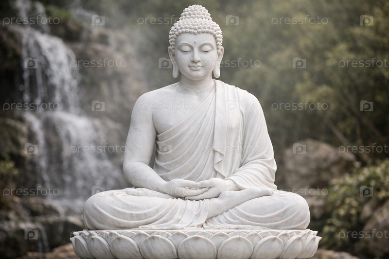 Мраморная статуя Будды в позе лотоса на фоне водопада и зеленого сада — медитация, спокойствие и духовность
