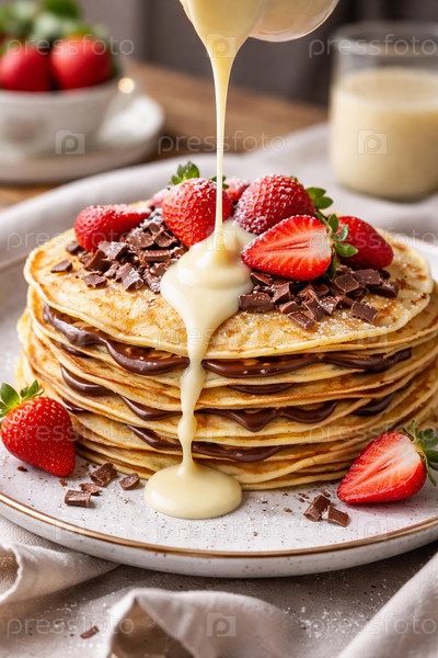 Аппетитная стопка пушистых панкейков с шоколадной начинкой, свежей клубникой, шоколадной стружкой и стекающей белой глазурью — крупный план, сервировка на тарелке