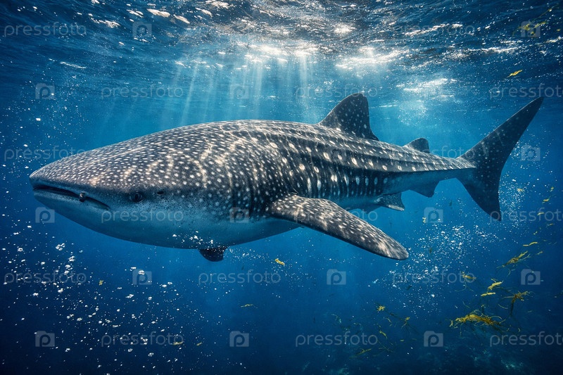 Китовая акула (Rhincodon typus) в крупном плане открытого океана медленное плавание под солнечными лучами, пятнистый цвет и подводные водоросли