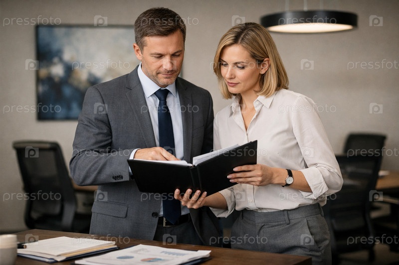 Деловая встреча в офисе: мужчина в костюме и женщина в блузке обсуждают документы в папке, совместное планирование проекта и рабочие задачи за столом