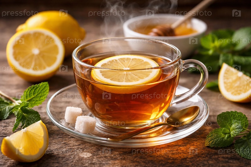 Горячий черный чай с долькой лимона, медом, сахарными кубиками и свежей мятой в прозрачной стеклянной чашке на деревянном столе, пар и уютная сервировка — натюрморт для кулинарных и лайфстайл проектов