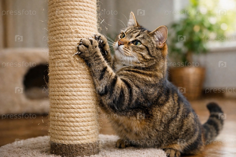 Полосатый домашний кот точит когти о сизалевый столб-когтеточку в уютной светлой гостиной