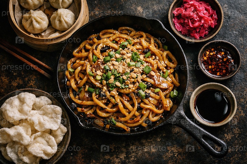 Жареная удон-лапша с арахисом и зеленым луком в чугунной сковороде, с паровыми пельменями, рисовыми чипсами, соевым и острым соусами — азиатская уличная еда в ресторанной подаче
