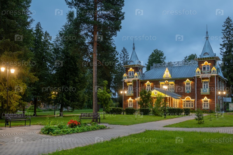 ТЕТКОВО, Тверская область, РОССИЯ 1 июля 2025 года: Дом культуры рекреационного комплекса "Тетково" в вечернем освещении.Он был построен в 1948 году в стиле русского терэма