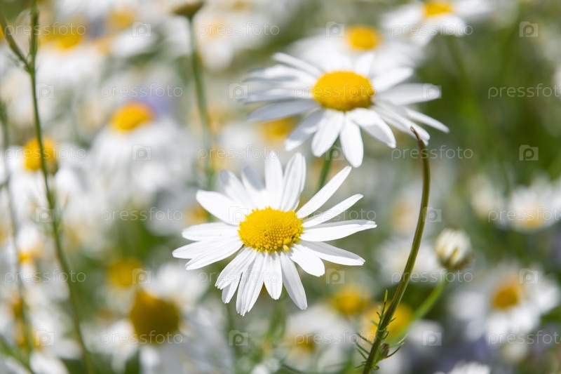 Небольшие ромашки цветут на поле в летний день