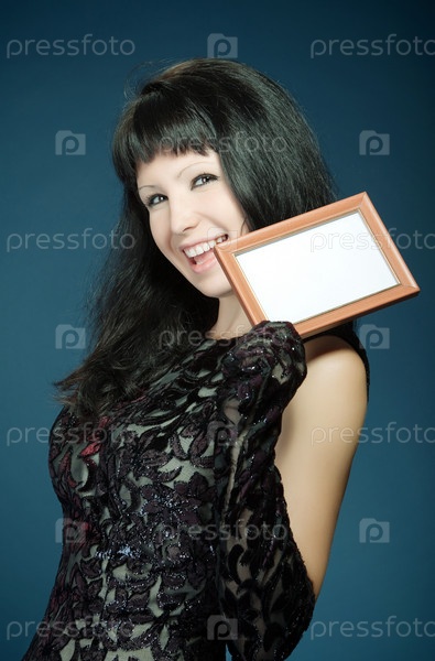 Счастливая женщина с рамкой для фотографии на синем фоне
