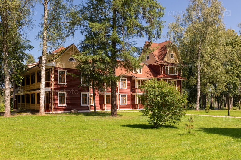 ТЕТКОВО, Тверская область, РОССИЯ 1 июля 2025 года: кедровое здание (коттедж No1) Тетковского оздоровительного комплекса