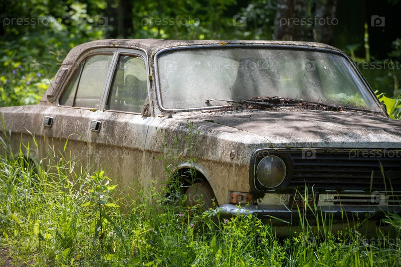 ГАЗ-24-10 Волга в густой траве. заброшенный советский автомобиль среднего класса, производимый Горьковским автомобильным заводом