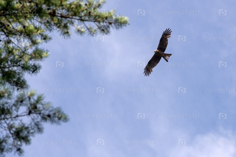 Черный воздушный змей, летящий против неба. хищная птица семейства ястребов