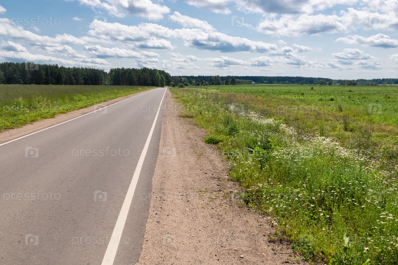 Прямая асфальтированная шоссе через поле в сторону леса