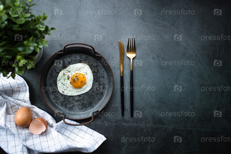 Домашнее жареное яйцо в старинной сковороде и стильные столовые приборы на темном фоне. Вид сверху. Копировать пробелы для текста